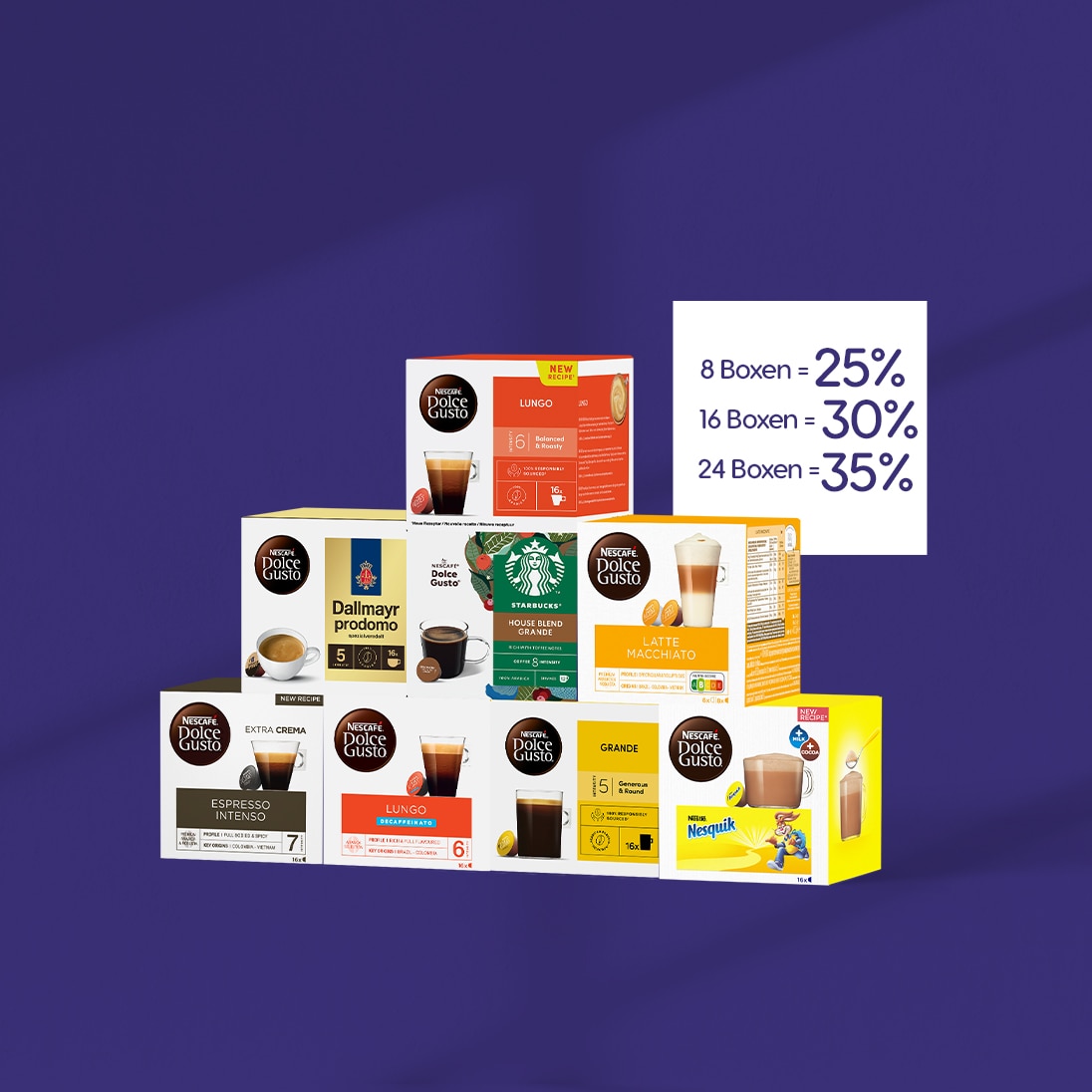 Alle unsere Kurz- und Dauerangebote findest du in unserem NESCAFÉ® Dolce Gusto® Online-Shop: Erhalte mindestens 20 % Rabatt auf unsere Kaffeemaschinen und/oder Kapseln für noch mehr Genussmomente.