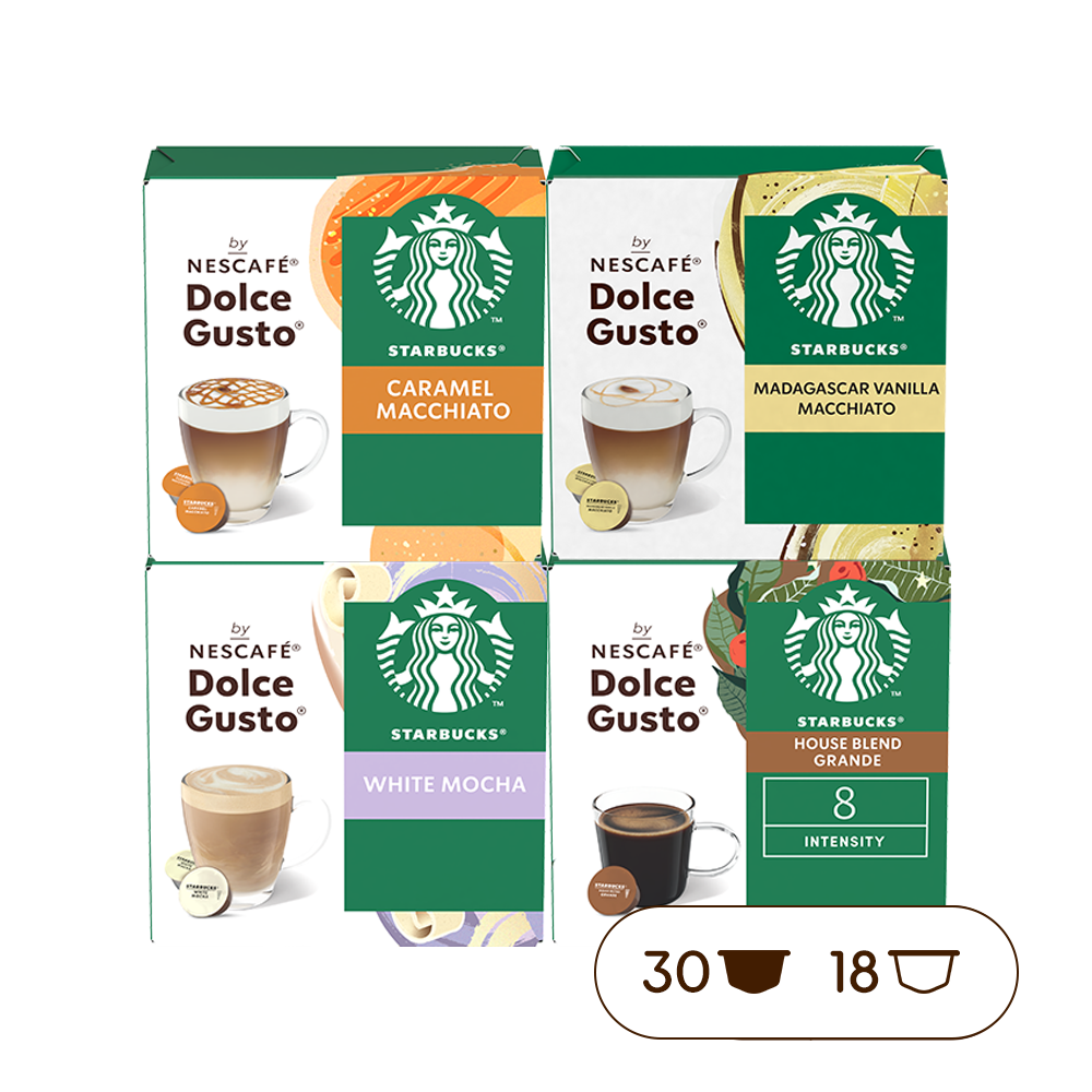 Starbucks®-Lovers aufgepasst! Holt euch Coffee-Shop-Feeling für zu Hause mit unserem Starbucks® Fan Bundle bestehend aus jeweils einer Packung Starbucks® Caramel Macchiato, Starbucks® Vanilla Macchiato, Starbucks® White Mocha und Starbucks® House Blend Grande.